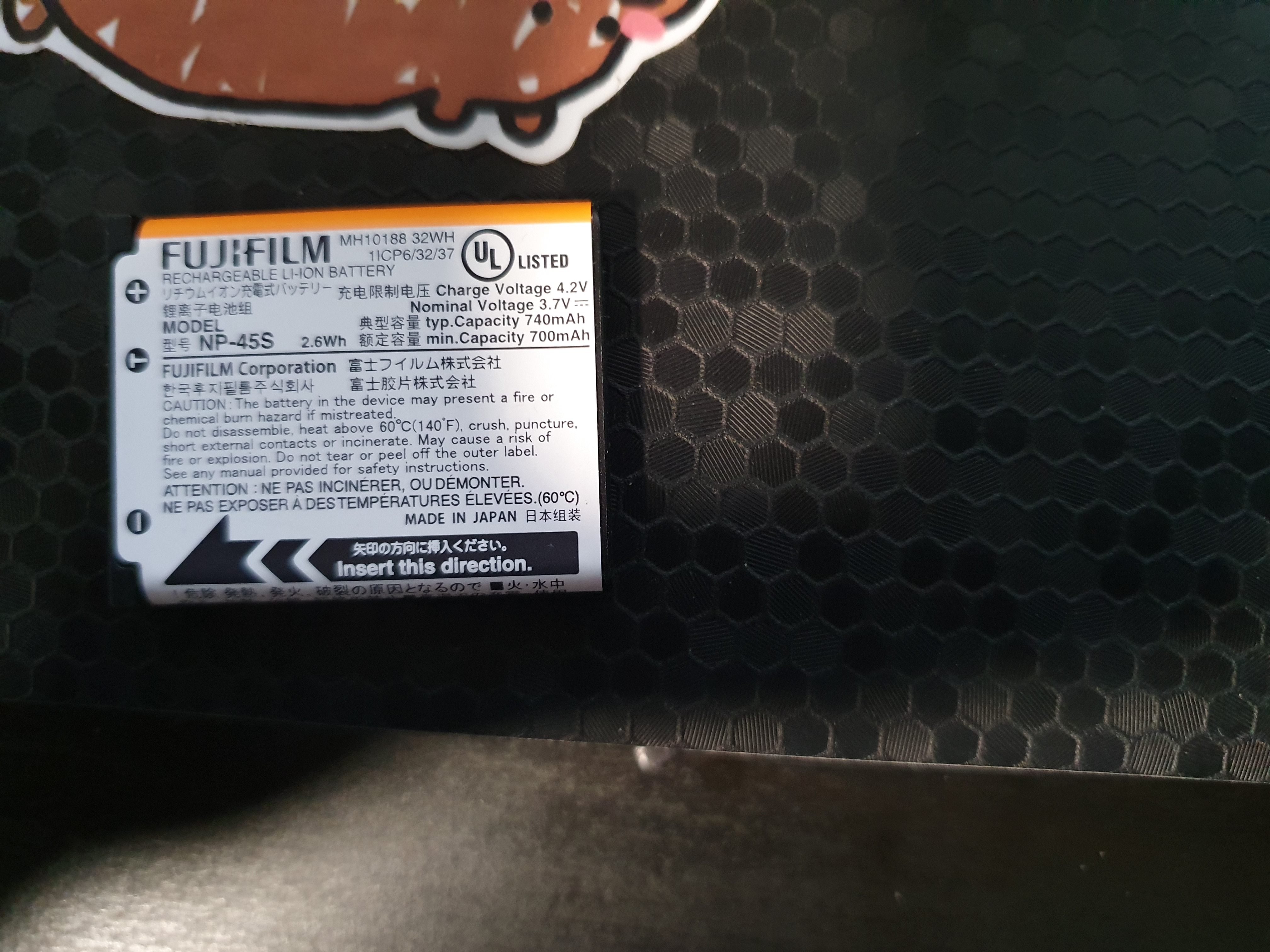The model is an NP-45S, and sadly there aren't any real datasheets available for this particular one. There is one out there for NP-45 though, which should be close enough. It's not much of a datasheet - no charge or discharge curves here - but it's got the numbers we're looking for.